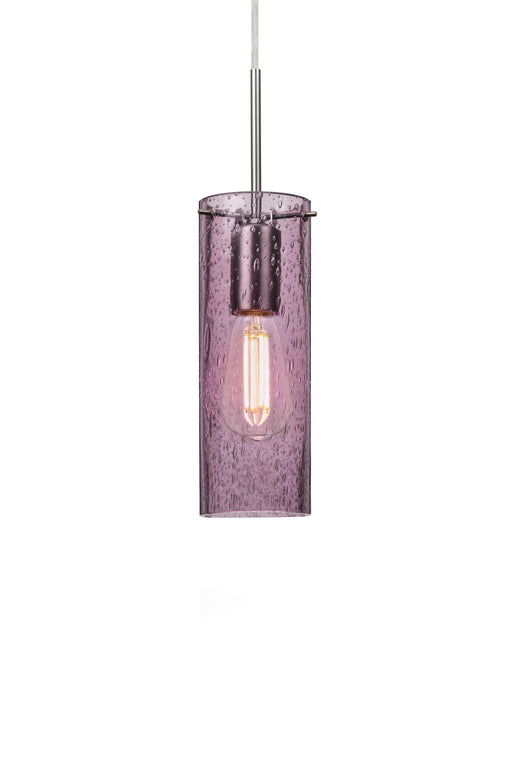 The Juni 16 Pendant is composed of a narrow transparent Plum glass cylinder, with an interesting bubble pattern blown randomly throughout the glass...