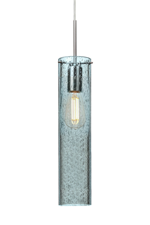 The Juni 16 Pendant is composed of a narrow transparent Blue glass cylinder, with an interesting bubble pattern blown randomly throughout the glass...