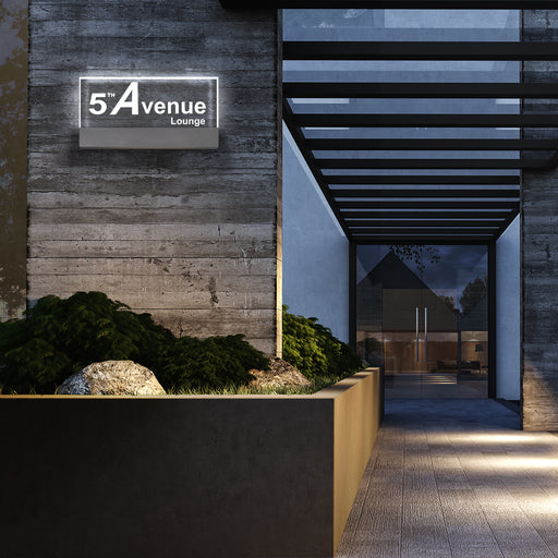 Halpern,Outdr,Led Sign,Lrg,MarDetails:Product Type: Wall Mt./FlushFinish: PlatinumShade: Clear AcrylicMeasurements:Width / Dia: 16.00"Height: 8.00"...