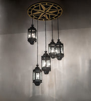 Expert craftsmanship comes to light with a stunning classic lantern design that entices. The five exquisite Gascony pendants feature a Beveled Clear Glass lens, revealing three complementary faux candlelights illuminating from within a total of 15 lights throughout the fixture. The lantern is enhanced with a frame and hardware featured in a Solar Black finish. The overall height ranges from 41 to 120 inches, as the chain length can be easily adjusted in the field to accommodate your specific lighting application needs. The classic styled fixture is ideal for illuminating stairways and entryways in residential, hospitality, and commercial settings. The lanterns are suspended from a decorative medallion featuring a Goldtastic finished Starburst design in a circle surrounding the inner cutout for the fixture. The background of this round medallion is featured in Oil Rubbed Bronze. The Gascony 5 Light Cascading Pendant is included in our American-made, American-designed, handcrafted Traditional Lighting Collection. It was manufactured in Yorkville, New York. UL and cUL listed for dry and damp locations. The fixture was created for The Memorymakers at Landmark Hospitality, which owns The Albion Summit in Summit, New Jersey.