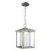 The Hunnington one light outdoor pendant fixture in weathered pewter creates a warm and inviting welcome presentation for your home's exterior. A bit of Shaker minimalism mixed with Arts and Crafts styling defines the transitional Hunnington outdoor lighting collection by . Equally at home in the city or the country, this timeless style will enhance the appearance of a home's entrance with its clean, crisp lines. Offered in Weathered Pewter or Black finishes, with either Etched Seeded glass or Clear Seeded glass, the assortment includes a one-light outdoor pendant, small and large one-light outdoor wall lanterns, a one-light out door post lantern and a two-light outdoor ceiling flush mount. Both incandescent lamping and ENERGY STAR-qualified LED lamping (for those fixtures with the Etched Seeded glass) are available for most of the fixtures, and some can easily convert to LED by purchasing LED replacement lamps sold separately (for those with the Clear Seeded glass).