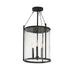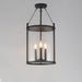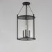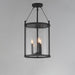 Squared columns in Matte Black finish tower above the cylindrical glass shade rated for outdoor applications. A rectangular hook detail carries the square form through to the backplate. A modern interpretation of a bell tower, these outdoor pendants and sconces are a cleaned up, transitional look for exteriors.