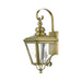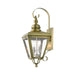 The stylish antique brass finish outdoor Adams wall lantern is a great way to update your home's exterior decor. A flat metal curved arm attaches the solid brass decorative housing to the square backplate while clear glass shows off the brushed nickel finish cluster.
