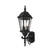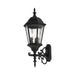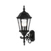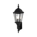 A decorative top and arm are paired with a simple six-sided frame in this textured black and clear water glass outdoor wall lantern is constructed of cast aluminum.