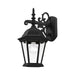 The elegant silhouette of the Hamilton collection is a classic that is sure to please even the most discriminating taste. This outdoor single-light downward hanging small wall lantern features a decorative top and arm which are paired with a simple six-sided frame in this textured black finish with clear beveled glass. Constructed of cast aluminum, this durable exterior fixture looks best in traditional or transitional outdoor settings.