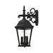 The elegant silhouette of the Hamilton collection is a classic that is sure to please even the most discriminating taste. This outdoor three-light downward hanging medium wall lantern features a decorative top and arm which are paired with a simple six-sided frame in this textured black finish with clear beveled glass. Constructed of cast aluminum, this durable exterior fixture looks best in traditional or transitional outdoor settings.