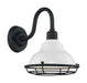 The one-light small Newbridge wall sconce is wet rated and can be employed for both indoor and outdoor lighting applications. The Newbridge has a gooseneck arm extension that is 13.5 inches and a width of 9.75 inches. The choice to add the included cage will realize a true retro - industrial appearance, complemented by the Gloss White shade and Textured Black finish, and light is dispersed by the white reflector.