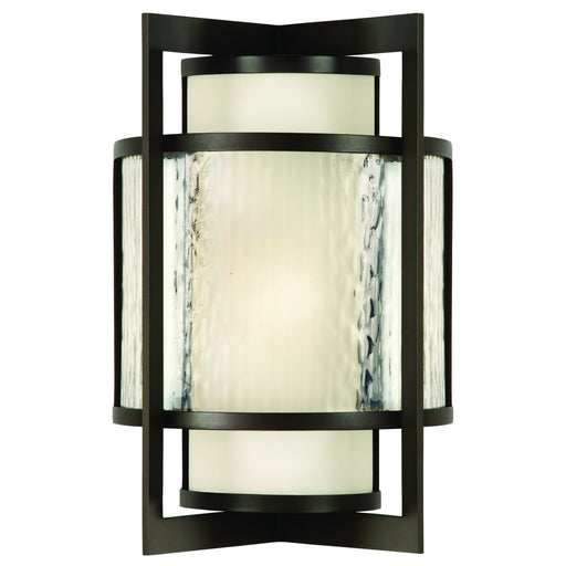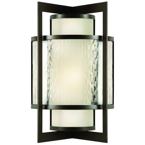 Outdoor aluminum sconce in dark bronze patina finish with off-white interior glass surrounded by a clear, textured outer glass.Details:Product Type...