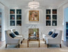 Oversized oval Lucite beaded center stem support a large dramatic shade bringing understated luxury to any room, with the Luxo collection. With the option to convert between a chandelier or ceiling mount, the versatility allows for accommodation of a variety of spaces. While sleek and streamlined, the shaded presentation offers a diffused ambiance that adds a sense of refinement and sophistication to many spaces and décor styles.