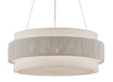 Our Rousham Chandelier, designed by Clarence Mallari, has an unusual accent on its fabric shade created by the twine panel made from recycled paper that is twisted and tightly wrapped around a metal frame. The panel made from the sustainable material, which is affixed to the center of the shade, is then coated with a sealant to protect it from moisture. The beige chandelier is suspended with aircraft cable and has a sugar white finish on the interior of the shade, which brightens the light.