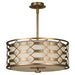 Pendant in a burnished gold leaf finish with subtle brown highlights and white textured linen inner shade. Fixture rod can be shortened to semi flush height.