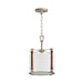 Inspired by the artist enclave north of San Francisco, pastoral elements influence this series of drum shades. Stirrup-like hooks support genuine suede straps in a Tobacco Brown finish which in turn suspend drum shades in an Off-white linen fabric. Metalwork in a hand-applied Weathered Zinc finish frame the frosted glass diffuser at the bottom to softly diffuse the lighting within. Head out West with this rustic, yet refined design.