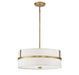 Pep up the lighting style in any room with this chic Meridian 4-light pendant. Pairing a drum-shaped shade of white fabric with a natural brass finish and cage detailing creates an intriguing look that is sure to please for years to come. Use solo or in multiples to create beautiful, fashionable illumination in rooms with contemporary, modern and transitional styles. This pendant is 8" in height and 20" in width, plus it includes four 12" downrods and one 6" downrod to let you adjust the height for a maximum of 62". This pendant uses 4 standard size bulbs of up to 60 watts each, is LED compatible and is dimmable. You can use this pendant on a sloped ceiling.