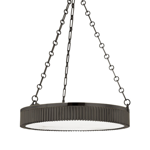 Rich metal fluting conceals the light source in our Middlebury family. The pendant`s chain-hung design bathes ceiling space in a warm wash of ambie...