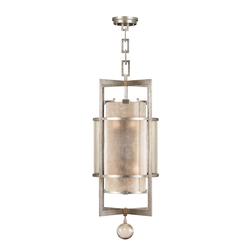 Lantern of steel in a warm muted silver leaf finish and warm translucent mica shade with metal frames. Features hand blown exterior glass sheath &a...