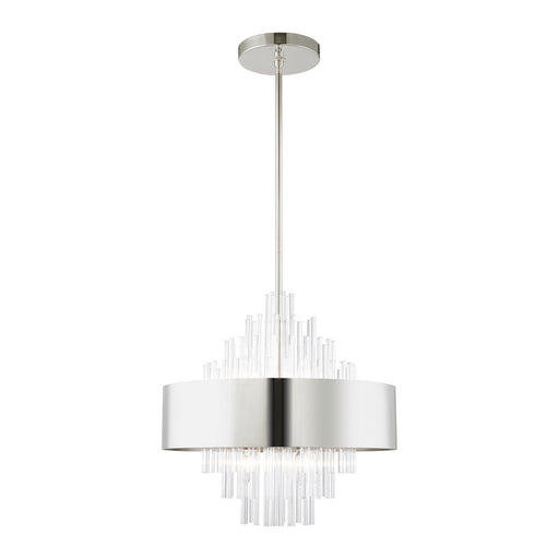 A dramatic addition in this sophisticated contemporary pendant brings a sense of luxury. Crystal rods tower above and hang below the polished nicke...