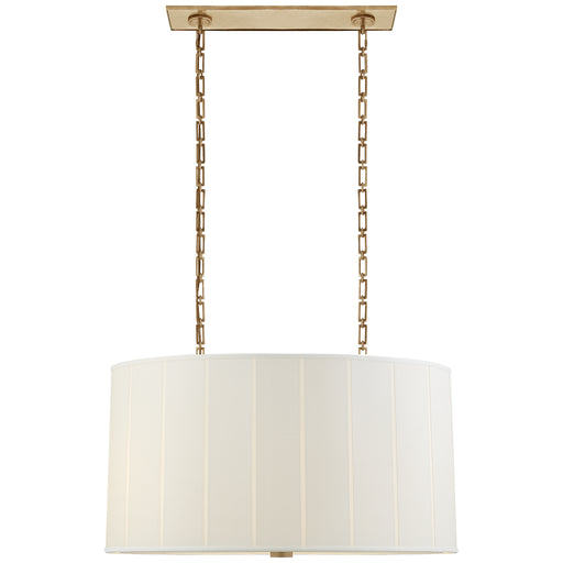 Perfect Pleat Oval Hanging Shade in Soft Brass with Silk ShadeDetails:Product Type: Drum ShadeFinish: Soft BrassShade: 35" x 36" x 19.25" Silk Oval...