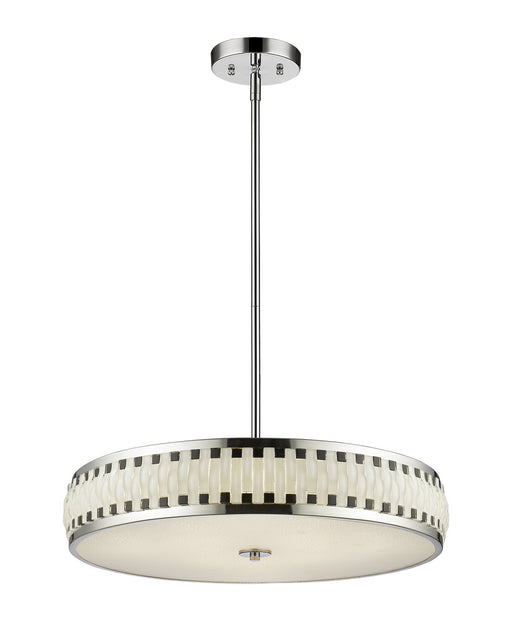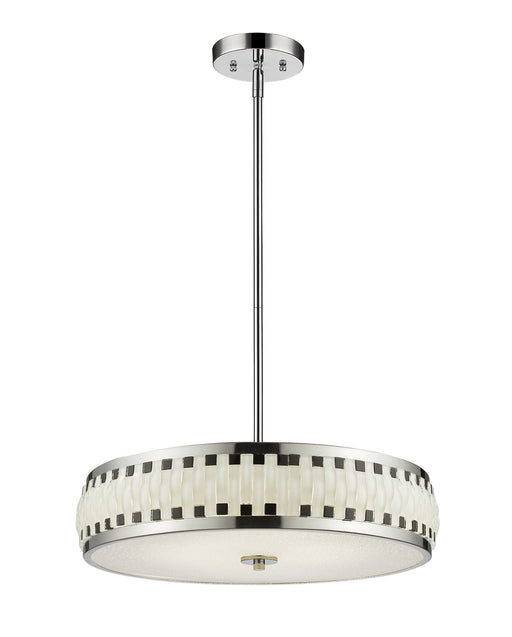 A white colored shade is paired with chrome bands and hardware to create a simple, contemporary look. This pendant includes an acrylic diffuser to ...
