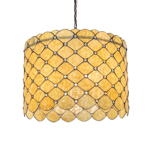 Diamond patterns of Bone Beige are accented with sparkling Clear jeweled droplets in this elegant high-fashion pendant shade. The versatile art gla...
