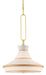 The Perth Pendant is made of metal in a mix of off-white and gold leaf finishes. Ian Thornton designed the gold and off-white pendant to be a new twist on a traditional pendant with a drum shade. Design details of note that he emphasized are the decorative loop and the finessed elements linking to it, the gold trim on the shade, and the acrylic diffuser.