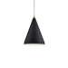 Single lamp pendant with conical aluminum shade with fine powder-coated or plated finishes with contrasting finial. Exterior shade colors are black or white with gold detail or brushed nickel with black detail. Suspended by cloth cable. Available in 3 sizes.