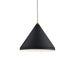 Single lamp pendant with conical aluminum shade with fine powder-coated or plated finishes with contrasting finial. Exterior shade colors are black or white with gold detail or brushed nickel with black detail. Suspended by cloth cable. Available in 2 sizes.
