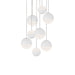 Round downward and upward light LED multi-pendant with nine stratum sphere shaped cast aluminum and matching heavy gauge frosted acrylic bottom diffuser pendants. Patent pending fixture design with maximum 120", adjustable Kuzco SSL wire provided with our powerful 120V AC LED technology, 45W, fully dimmable. Available metal finishes in matte black or matte white. Upward and downward single, multi-pendant arrangements and wall sconces available, see series for full family details.
