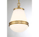 The Endura 1-light pendant showcases vintage inspiration boosted by thoughtful touch of nautical flair. The teardrop-shaped shade of etched white opal glass wears a belt with textured details finished in Warm Brass. Endura is 16.38" in height and 10" in width. It comes with 120" of chain. Uses one standard size bulb of up to 60 watts. Bulb not included.