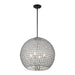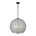 Cassandra features a dazzling array of K9 faceted crystal gems suspended within a modern frame. Light artfully reflects and refracts through these elements to provide a dramatic focal point to any room. This four-light globe crystal pendant will add an unmistakable touch of elegance to your dining room, kitchen or a bedroom. It is shown in a black finish with a brushed nickel finish cluster.