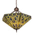 This pendant features a stained glass shade recreating a Tiffany design inspired by glass used in castles and cathedrals in England. These motifs, also used in German and Flemish ornamentation, complement a fanciful interlaced mosaic design of Moss Green, Cobalt Blue and Amber glass and accented with Amethyst jewels and banded with mottled Violet art glass. The shade is created with the famous Meyda Tiffany copper foil construction and enhanced with a Mahogany Bronze finish. Overall height ranges from 28 to 63 inches as the chains can be easily adjusted in the field. The Tiffany Elizabethan Inverted Pendant is featured in our American designed, handcrafted Stained Glass Lighting Collection. UL and cUL listed for dry and damp locations.