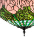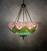 A wreath of full blooming Passion Pink cabbage roses circle this beautiful stained glass shade in a design inspired by the Louis Comfort Tiffany studio. Bronzed Green leaves and Teal Green stems form a pattern against a Blue Opal sky. This inverted shade is created using the famous Meyda Tiffany copperfoil construction. The shade is complemented with a Mahogany Bronze finish. The overall height ranges from 32 to 67 inches as the chain length can be easily adjusted in the field to accommodate your specific lighting application needs. UL and cUL listed for dry and damp locations.