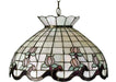 Grace your home with this elegant crowned shade, featuring a gridwork of Opal Iridized glass, adorned with a Plum colored border of swirling ribbons and perfect Ice Pink rosebuds. The Tiffany style stained glass pendant is made of hand cut stained glass in a copperfoil construction.