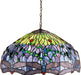 This version of Tiffany Studio's most beloved stained glass dragonfly design, is modeled after the original hanging head dragonfly. Diving dragonflies with glowing Scarlet jeweled eyes and delicate metal filigree wings circle over hand cut and copper foiled pieces of Amber streaked, Pond Green and dusky sky Blue Violet art glass accented with glistening jewels of Sea Green and Amber, representing an early evening sky reflecting on rippling water The pendant hardware is finished in a warm hand applied mahogany bronze.
