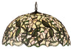 This pendant has an undulating edged stained glass shade of Pale Blush pea flowers that are surrounded by gracefully twining leaves and vines of Spring Green against an Ivory Pearl background. The nature inspired shade pattern, designed by one of the Meyda Tiffany artists, is supported by pendant chain and canopy with a warm Mahogany Bronze finish.