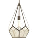 Cinq finds inspiration from modern geometric designs and the beauty of contrasting elements. Five-sided bottom panels feature antique mirrored glass, while the upper panels are comprised of clear glass. This one-light pendant fixture from our Design Series collections is finished in Antique Bronze.