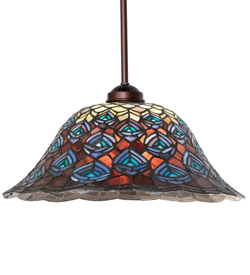 In the tradition of the Prairie School, organic objects were interpreted into geometric forms. In this pendant Meyda Tiffany uses colorful interloc...