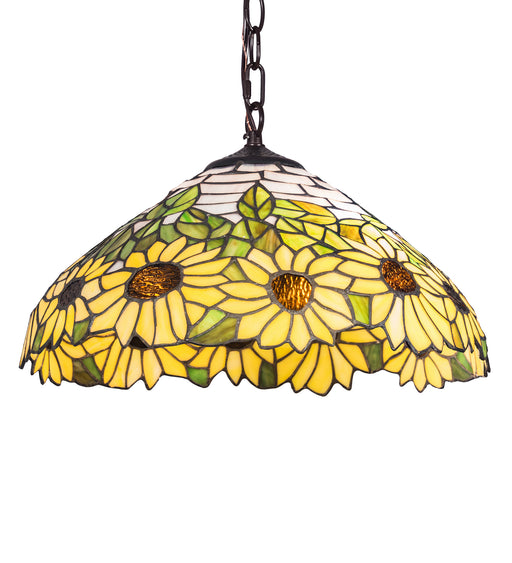A field of sparkling Country Brown eyed, Farm Yellow leaves, edge this Meyda original Tiffany style Sky Blue sunflowers growing on stalks of summer...