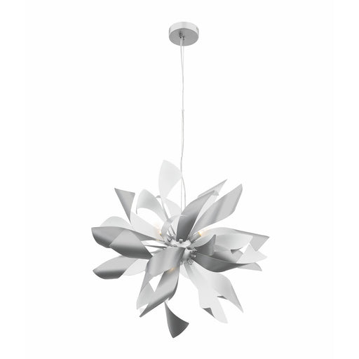 9-Light Decorative Floral Windmill Styled Silver Chandelier.Details:Product Type: StarburstFinish: Silver w/Matte WhiteMeasurements:Width / Dia: 24...