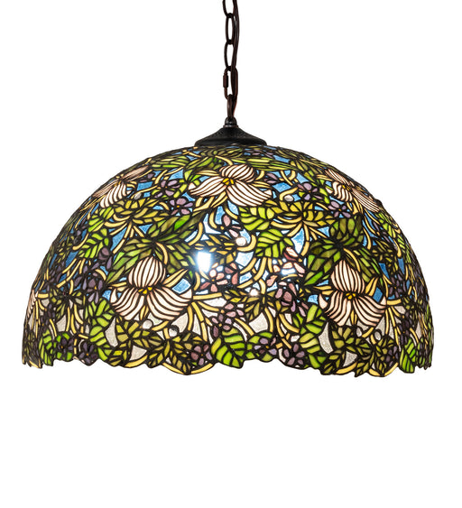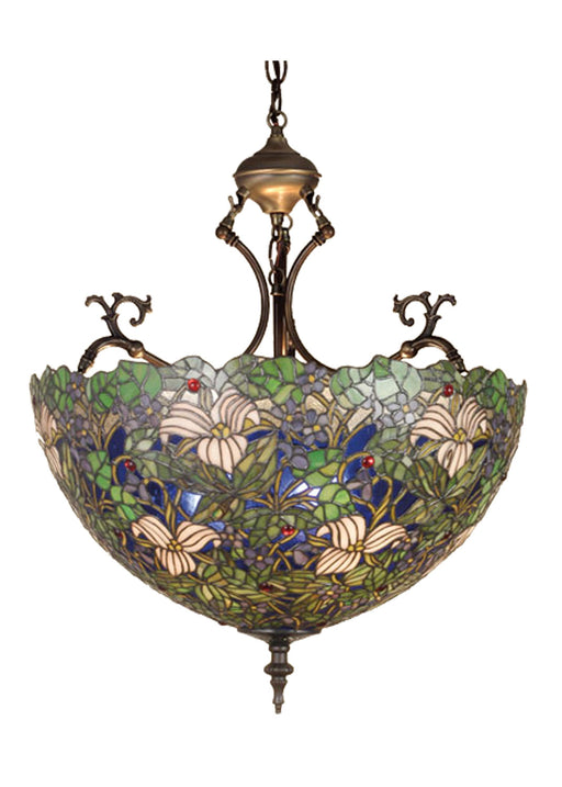 Nature abounds in this resplendent stained glass pendant. Glistening Red Glass Berries, Ivory Trilliums, and clusters of Purple Violets with Woodla...