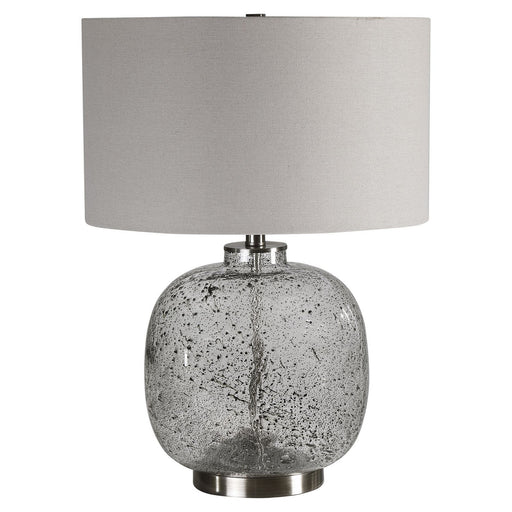 Modern Style Table Lamp Features A Translucent Art Glass Base With Abstract Black Flecks Throughout, Accented With Brushed Nickel Details. The Roun...