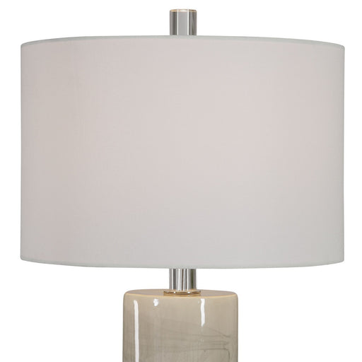 Modern In Design, This Ceramic Table Lamp Showcases A Neutral Beige Glaze With An Abstract Gray Drip Pattern, Paired With Elegant Crystal Details A...