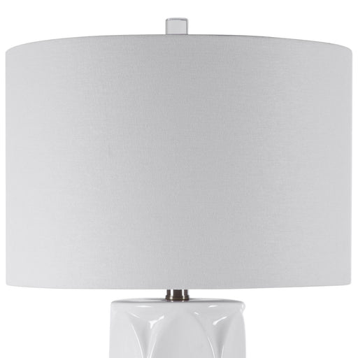 This Ceramic Table Lamp Showcases A Touch Of Mid-century Style With A Dimensional Geometric Design Finished In A Glossy White Glaze, Accented With ...