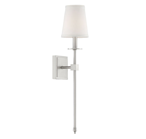 This Savoy House Monroe 1-light sconce features a long sleek body, a white fabric shade and a classy, contemporary silhouette. polished nickel fini...