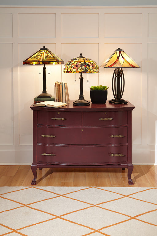 Gentle scrollwork and Tiffany style in a classic pattern brings sophistication to the Asheville Collection. The Tiffany glass is hand assembled usi...