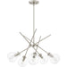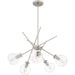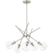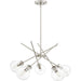 Bold lines and glass orbs create a modern, futuristic look in Asha. The sputnik-inspired chandelier comes in brushed nickel and features open, clear glass globes for a playful lighting effect. With a fun and geometric design, Asha makes an eye-catching statement over a kitchen island, table, or in a living room.