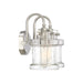 Traditional in design yet transitional in execution, the Danbury collection features globes in seedy glass with a unique jar-like silhouette. The decoratively capped center rod supports gooseneck arms that secure the vintage-inspired globes with exposed latches. The versatility of the collection is further defined by its lustrous Polished Chrome, Brushed Nickel, or Earth Black finish.