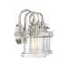 Traditional in design yet transitional in execution, the Danbury collection features globes in seedy glass with a unique jar-like silhouette. The decoratively capped center rod supports gooseneck arms that secure the vintage-inspired globes with exposed latches. The versatility of the collection is further defined by its lustrous Polished Chrome, Brushed Nickel, or Earth Black finish.
