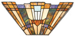 A classic geometric Arts & Crafts piece with handcrafted art glass in shades of sapphire blue warm honey amber and cream.