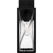 Zarah outdoor wall lanterns are the perfect companion to transitional style exteriors. The sturdy matte black frame is accentuated by clear hammered glass, featuring a fun twist design. Designed to withstand the elements in style, Zarah is an easy way to add illumination to a front porch or landscape.
