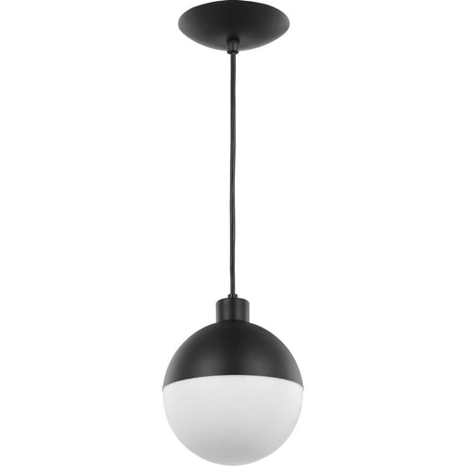 A distinctive classic globe pendant is accented by a striking metal black cap. The cap holds a beautiful opal glass shade ready to emit gentle illu...